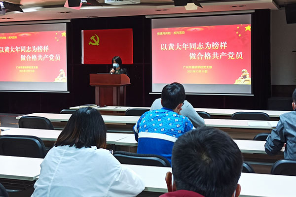 2021年12月15日,广州市康纳学校党支部开展“以黄大年同志为榜样,做合格共产党员”专题党课,陈楚卿副书记主持, 30名党员参加学习。