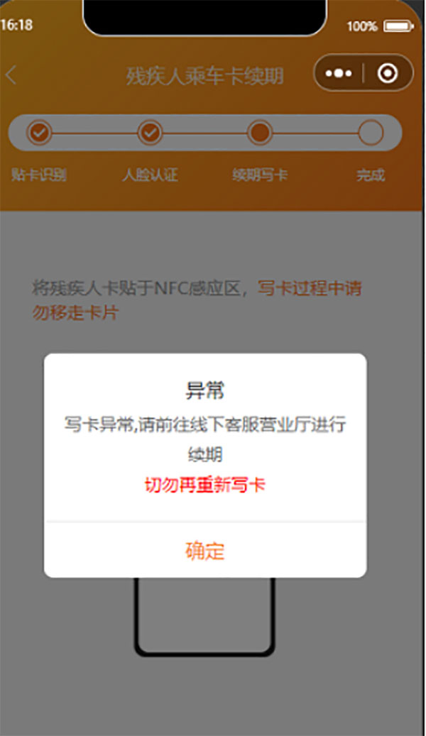(二)当连续出现“续期异?!?次时,系统会提示“请前往线下营业网点进行续期”(如下图),前往此时需前往线下网点进行续期。(因连续写卡异常,存在写坏卡的可能,因此需要前往线下网点进行续期,此情况为写卡时异常情况,极少发生)