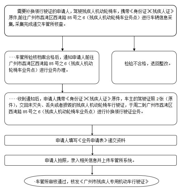 办理流程 | 1.申请人驾驶残疾人机动轮椅车,携带《中华人民共和国居民身份证》、《中华人民共和国残疾人证》或《中华人民共和国残疾军人证》、《残疾人机动轮椅车行驶证》原件,前往残疾人机动轮椅车业务点,进行车辆信息采集,采集完成递交车辆管理所核查,车辆验核合格后通知申请人办理; 2.交回未灭失、丢失或损毁的行驶证原件; 3.领取《残疾人机动轮椅车行驶证》 |